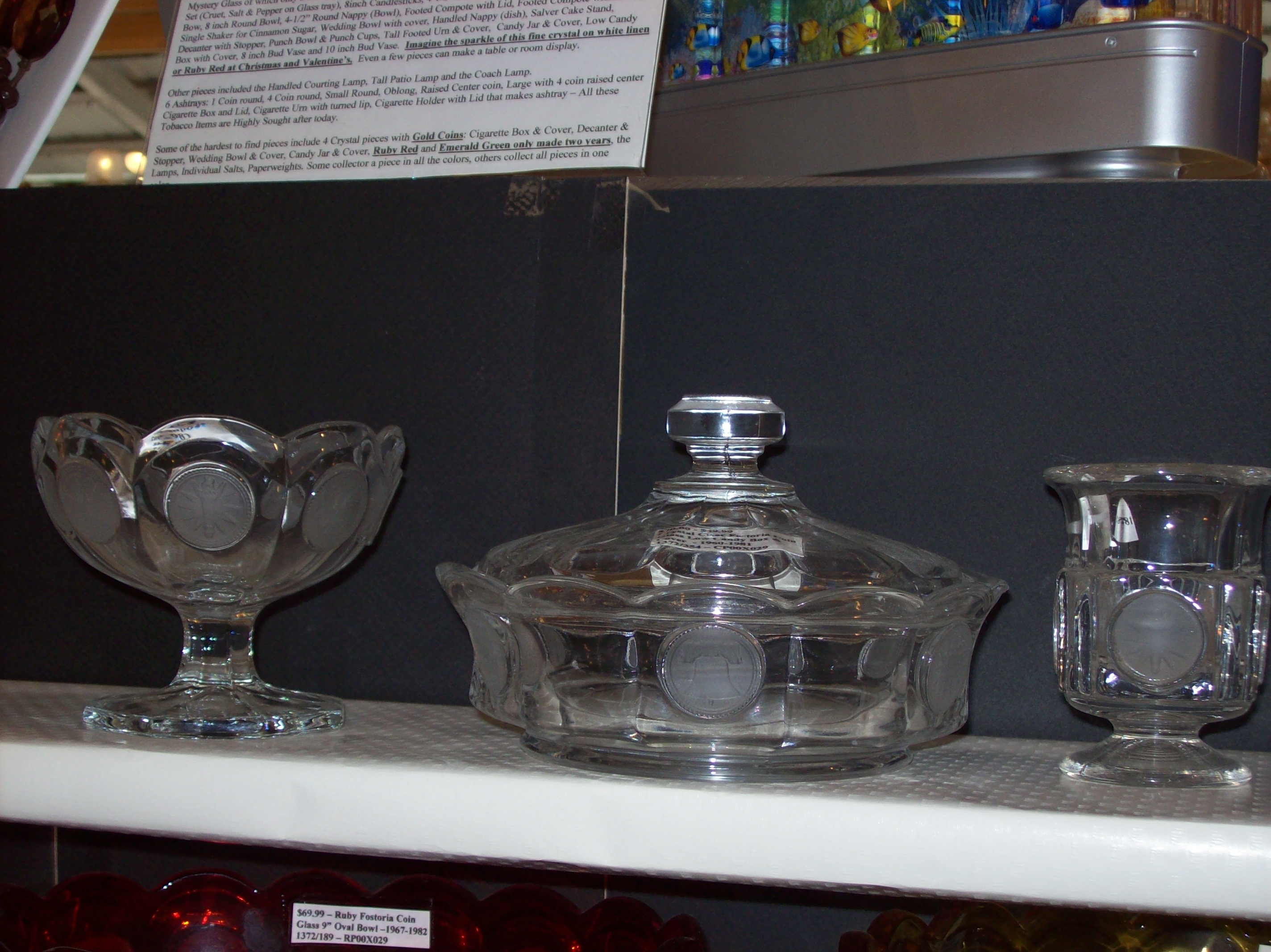 | $38.99 Fostoria Crystal Coin Glass 4-1/8” Tall X 3-3/8” | Fostoria Crystal Salt & Pepper. 1964-1978 - #1372/652 | Fostoria Crystal Candy Jar with Cover. $24.99 | |