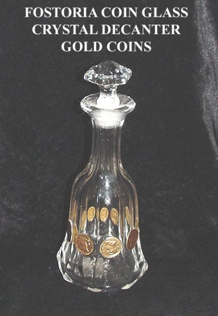 Rare -The 1 Pint Fostoria Coin Glass Crystal Decanter with Stopper- Gold Coins. Handcrafted by the Fostoria Glass Company of Moundsville, West Virginia during the years 1960-1965. A part of the original Gold Coin Design Collection, #1372/400. 10 3/16" Tall. Excellent Condition. No chips, cracks or scratches. Gold Coins-Date 1887. A hard-to-find and exquisite Gold coin glass decanter. |